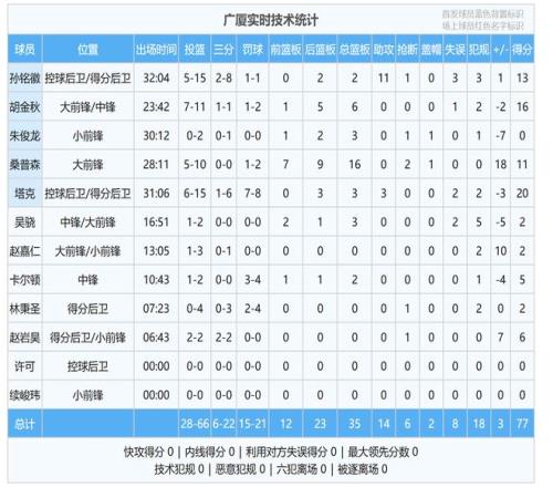 全场比赛,桑普森一共打了28分11秒,投篮10中5,命中率达到了五成,交出了11分16篮板2抢断的出色数据, 正负值为+18,是全队效率最高的球员。毫无疑问,桑普森就是广厦队赢球的关键先生。