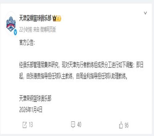 昨天(1月4日),天津荣钢篮球俱乐部发布官方公告: