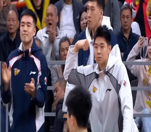 焦泊乔篮下暴扣后崔永熙在场边亮肌肉庆祝。