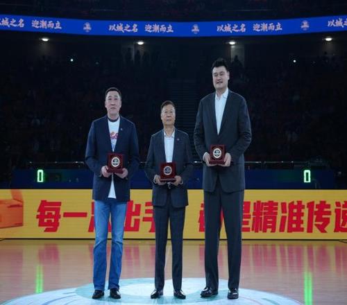 在备受瞩目的致敬环节,俱乐部为李秋平、姚明、刘炜、章文琪四位上海篮球功勋人物精心准备了功勋纪念章。上海市体育局局长徐彬、久事集团董事长过剑飞、上海市篮协会长龚德庆,分别为到场的李秋平、姚明、章文琪三位俱乐部功勋教练员、运动员颁发功勋纪念章。老队长章文琪则手持一枚镌刻着2001—2002赛季夺冠阵容全体成员签名的纪念篮球,郑重交到现任队长王哲林手中。这不仅仅是一件穿越时空的信物,更是将“顽强拼搏、追求卓越”大鲨鱼的精神密码,传递到新一代运动员的手中。
