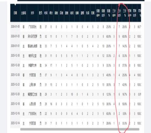 前六场比赛,他的三分命中率依次是33.3%,0%,50%,16.7%,42.9%,25%。