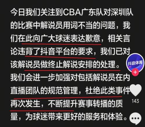 在深夜12点,抖音平台也是在第一时间对此事进行了处理,对该解说员做终止解说安排的处理。同时,也是向广大广东队球迷表达歉意!