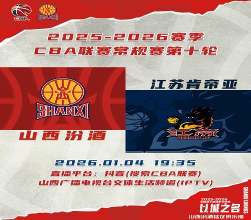 北京时间2026年1月4日19:35,2025-2026赛季CBA联赛常规赛第十轮继续进行,山西汾酒继续坐镇主场,迎战江苏肯帝亚,球迷观众可以通过抖音(搜索CBA联赛)、山西广播电视台文体生活频道(IPTV)观看比赛实况,敬请期待!
