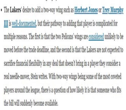 Stein表示,湖人想要引进赫伯特-琼斯或特雷-墨菲三世这类攻防兼备的侧翼球员,这一意向早已见诸报道,但他们完成这笔引援的难度不小,原因是多方面的。其一,鹈鹕队的这两位侧翼球员在交易截止日前被交易的可能性不大;其二,湖人方面不打算在任何交易中牺牲薪资灵活性,除非能换来他们认为能真正改变战局的球员。