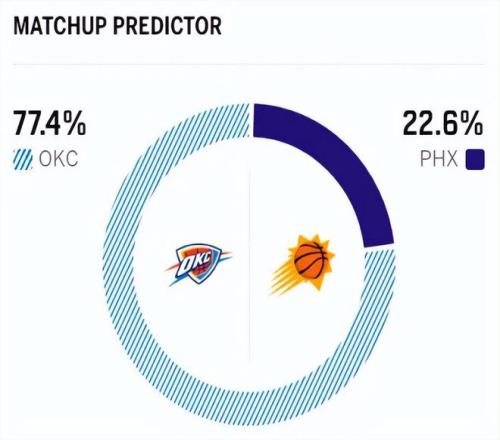 赛前,美媒ESPN对本场比赛进行了胜率预测,雷霆胜率高达77.4%, 太阳队胜率则意外达到了22.6%,算是近期对阵雷霆胜率较高的一支球队了。