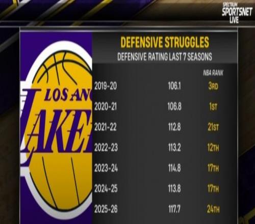 而比进攻问题更棘手的,是湖人一如既往糟糕的防守。截至目前,湖人的场均失分达到117.4分,已经超过了球队的场均得分117.2分,防守效率更是低至117.7,排在全联盟第24位,这样的防守表现,完全不符合一支争冠球队的定位。同时,球队的场均篮板数只有41个,位列联盟第26位,篮板球保护不力,也让湖人在攻防转换中屡屡陷入被动。尽管湖人的进攻效率能够以117.3排在联盟第七,展现出了不俗的得分能力,但如此严重的攻守失衡,注定让他们难以在季后赛的舞台上走得更远。