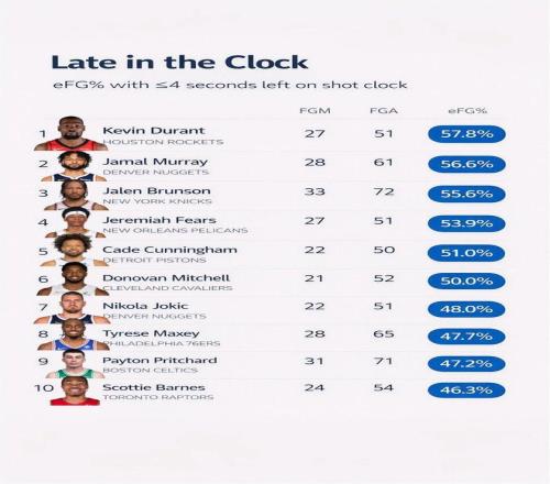 值得一提的是,献上绝杀的杜兰特在此役还创下了NBA第1神迹。美媒Automatic的数据显示:本赛季至今,进攻时间最后4秒以内的有效投篮命中率排名前十,杜兰特57.8%力压贾马尔穆雷、杰伦布伦森排名第一!