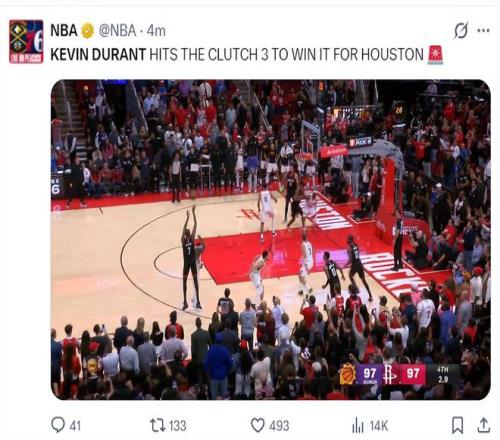 NBA官方也晒出了杜兰特迎着防守干拔的准绝杀三分球,全场球迷高呼MVP。