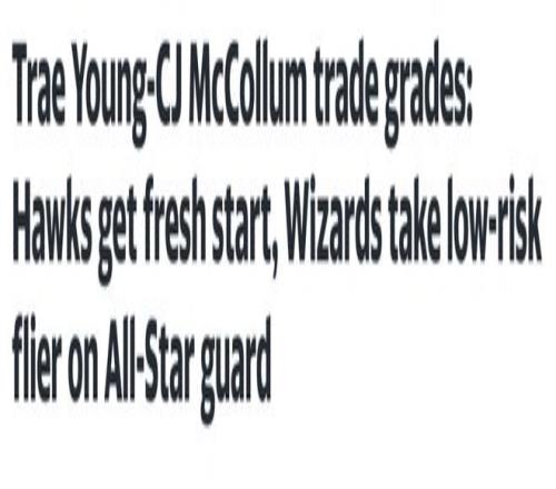 北京时间1月8日,老鹰和奇才达成一笔1换2的交易,老鹰送出特雷-杨,从奇才换来麦科勒姆和基斯珀特,这笔交易未涉及任何选秀权筹码。随后美媒雅虎体育对这笔交易进行了评级,老鹰获得B的评分,而奇才获得B+的评分。从目前来看,奇才更被看好成为这笔交易的赢家。
