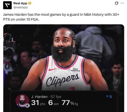 快船队之所以能够轻松击败篮网拿下大胜,后场核心哈登的稳定输出是关键原因之一,成功创造一项历史第一纪录。