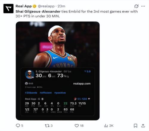亚历山大再一次三节打卡下班,28分钟,15中11,三分2中1,罚球7中7,拿到30分6助攻2篮板4抢断,命中率73.3%,三分命中率50%,真实命中率83%,正负值+22,本赛季他第16次三节打卡,只有17场比赛打了第四节。