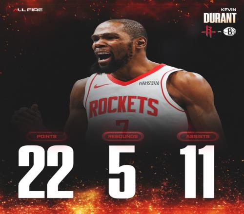此役后火箭拿到21胜10负跟西部第五的湖人拉开到1个胜场,火箭距离西部第三的掘金也只剩下1个胜场,杜兰特在这一波四连胜中的贡献是火箭最高的。