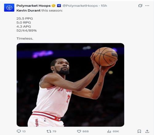 本赛季37岁的杜兰特场均36分钟(联盟第四),场均25.5分5篮板4.5助攻0.8抢断0.9盖帽,命中率52.2%,三分命中率43%,罚球命中率89.6%,他的罚球只差0.4%就可以再度达成180俱乐部。