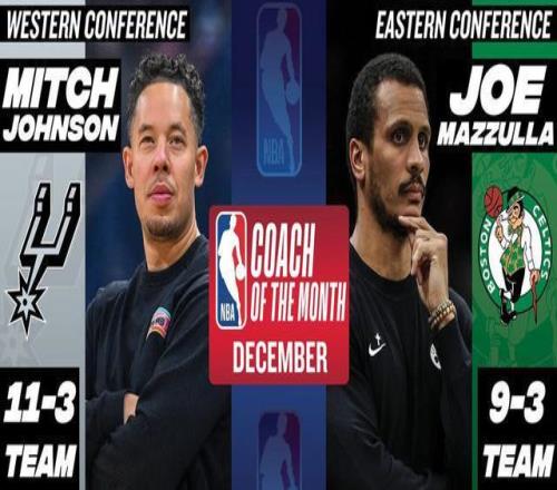 北京时间1月3日,NBA官方正式公布2025-26赛季12月的月最佳教练,圣安东尼奥马刺的主教练米奇-约翰逊与波士顿凯尔特人的主教练乔-马祖拉分别当选。