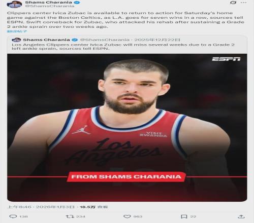 更加利好的是,快船要迎来祖巴茨的复出。
