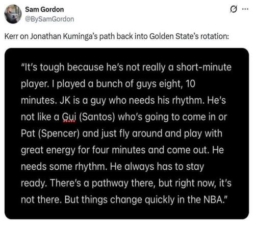 值得一的是,在勇士官方临时宣布这一消息前不久,主帅科尔才在公开的采访中表示受到球队多人因伤缺席的影响,本场比赛库明加一定会出战。