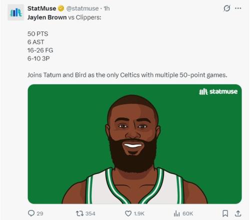 首节布朗就斩获13分,半场已经拿到20分,第三节更是爆炸单节8中7+三分4中3拿到19分2助攻,末节仅仅打了5分钟不到就拿到11分让比赛早早进入垃圾时间。