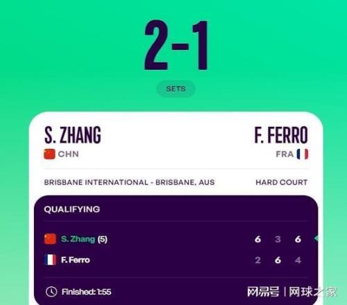 等到费罗从第五局开始缓过神后,越战越勇的张帅根本没给她翻盘的机会,以6比2轻松拿下了第一盘。