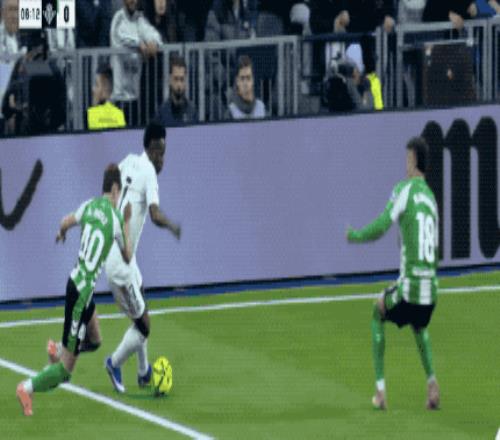 本场比赛,姆巴佩因伤缺阵,贡萨洛·加西亚首发出场。开场之后,维尼修斯就在右路多次过人成功,贝蒂斯防线明显顶不住。