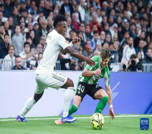 1月4日,皇家马德里队球员维尼修斯(左)和皇家贝蒂斯队球员安赫尔·奥尔帝斯拼抢。新华社发(古斯塔沃·巴连特摄)