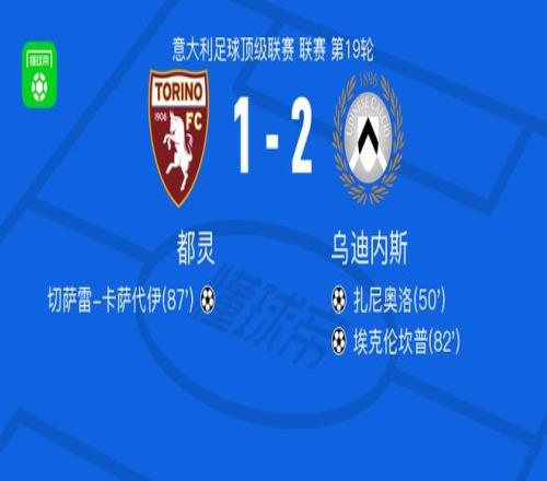 北京时间1月8日,意大利足球顶级联赛第19轮,都灵坐镇主场迎战乌迪内斯。比赛中,乌迪内斯率先打破僵局,扎尼奥洛接扎诺利助攻完成破门。随后,乌迪内斯扩大领先优势,埃克伦坎普在凯南-戴维斯的助攻下再下一城。比赛临近结束前,都灵由切萨雷-卡萨代伊接拉扎罗传球扳回一球。最终,全场比赛结束,都灵以1-2不敌乌迪内斯。
