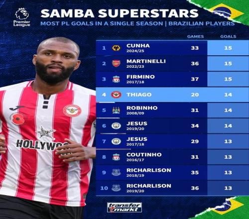 伊戈尔-蒂亚戈目前以20场14球排在榜单第4位,距离打破15球的纪录仅差2球。