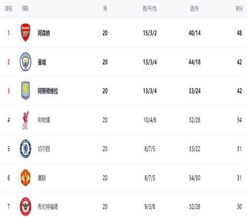 在积分榜上,阿森纳以48分排名榜首。阿森纳的优势扩大了,领先身后的曼城6分之多,争冠形势非常乐观。阿斯顿维拉的积分和曼城一样,也是42分,排名第3。第4的是利物浦,拿到34分。利物浦的排名要想提升非常困难,保住第4名或许是最靠谱的目标。切尔西和曼联都是31分,排名第5和第6。热刺只拿到27分,排名第13。