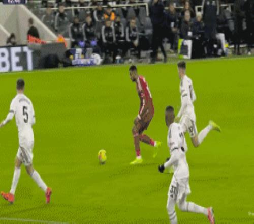 比赛第53分钟,利物浦球员索博斯洛伊开出角球,麦卡利斯特头球攻门,皮球击中横梁弹出。