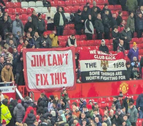 足总杯被淘汰,现场曼联球迷打出横幅:吉姆解决不了这个问题