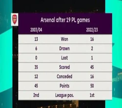 英超半程战罢,积分榜前七名的格局可谓泾渭分明又充满悬念。阿森纳以45分强势领跑,这个分数已经与阿森纳2003-04赛季不败夺冠时的半程积分相同,展现出了他们争夺冠军的稳定性和决心。不过,2年前阿森纳曾有过半程50分的壮举,但仍在最后时刻被曼城反超。
