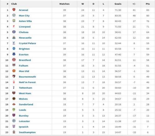 英超2025年积分榜:阿森纳83分居首,曼城第二利物浦第四