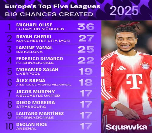 2025年即将结束,知名数据机构Squawka统计了五大联赛本年度创造绝佳机会数据,拜仁攻击手奥利塞高居榜首,曼城中...
